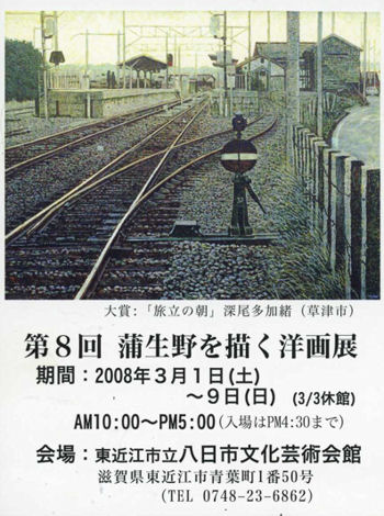 | 開催要項 このコンクールは、野口謙蔵画伯(蒲生町綺田)の顕彰事業のひとつとして、蒲生野の自然風土を豊かな想像性によって描く優れた洋画家を発掘・育成することを目的に、近畿、滋賀県の隣接県から洋画作品の一般公募をするものである。 1、蒲生野の自然や風土を描いた作品とする(範囲は地図参照) 2、洋画(油彩・水彩・パステル等)の平面作品で、具象画に限る。 3、サイズは20号以上50号以内とする。 etc. この展覧会の「大賞」の副賞(50万円)に誘われて、初めて応募しました。残念ながら賞金は蒲生野の彼方に・・・ でも、なんとか「選外」をクリアーして展示してもらえることになりました(^_-)-☆ |