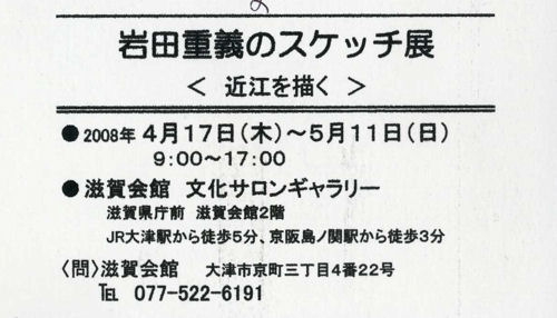 岩田重義のスケッチ展 2008・4・19 滋賀の風景をシンプルな線と淡彩で描かれている画家・岩田重義さん(大阪府高槻市在住)のスケッチ展「近江を描く」が、滋賀会館文化サロンギャラリーで開かれています。 |