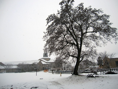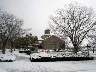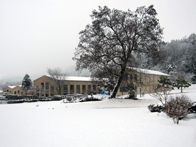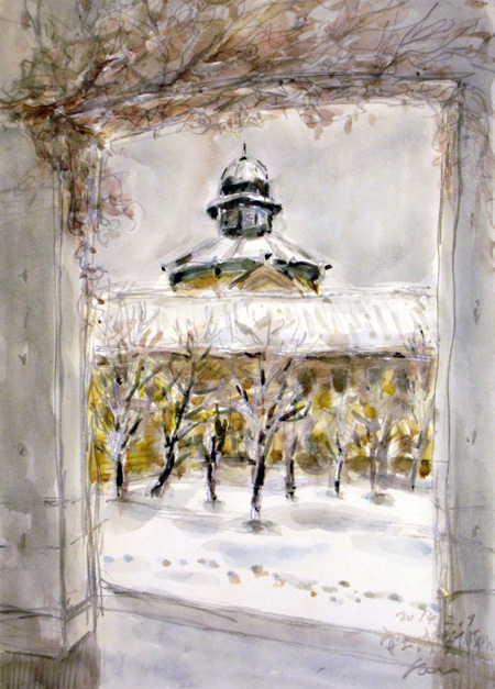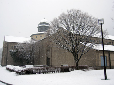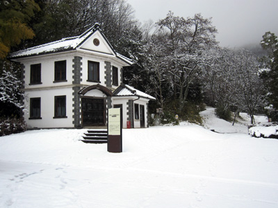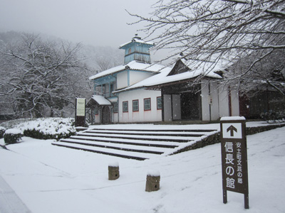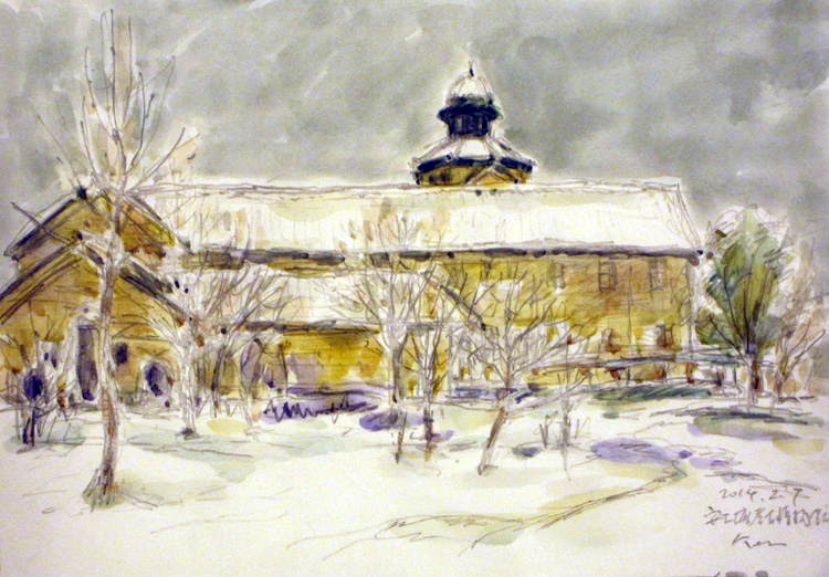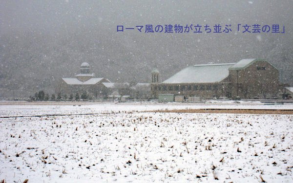 | 三日続けての雪、「低山歩きとスケッチ」をしようと安土へでかけました。JR琵琶湖線安土駅に降りると強い風に雪が吹雪いている。観音正寺のある繖山めざして約25分のアプローチを急ぐ。住宅街を過ぎると、雪景色の中にローマ風の建物が建ち並ぶ「文芸の郷」のが見えてくる。この施設の裏側に繖山への登山口の一つがあります。まず、登る前に少し散策をしてスケッチをしよう。 |