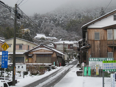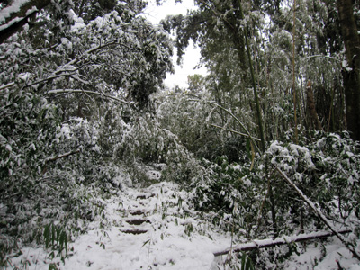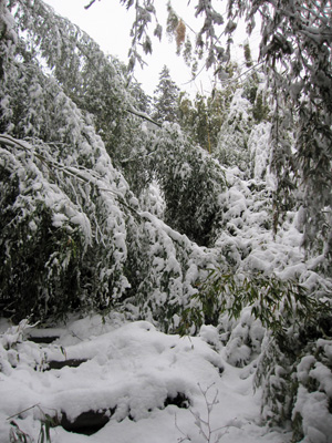 | スケッチしてから、アイゼンを付けて繖山登山口へ向かう。だが、下の写真のごとく、登山口を入ると重い雪に木々が垂れ下がっていて、かきわけて歩きだしたが、どうにもならずギブアップして引き返しました。 残念ながら京の雪山歩きは断念する。まあ、なんとか二枚スケッチできただけで良しとしよう。 |