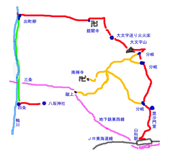赤ライン:今日歩いたルートはルートです。 緑ライン:京阪電車で移動 |