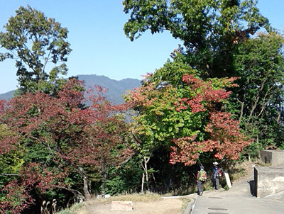 ![]() 火床から下山道へ 紅葉した木々の間に比叡山が展望できる。 |