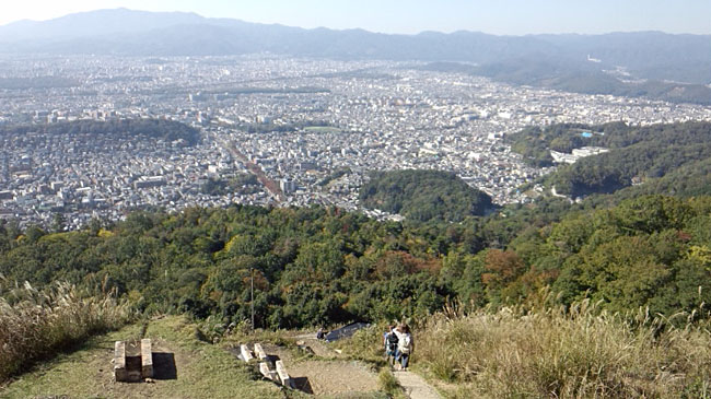 ![]() 大文字山頂上からの京都市街展望 展望を楽しみながら昼食&休憩をとる。 13:25 銀閣寺目指して下山開始。 |