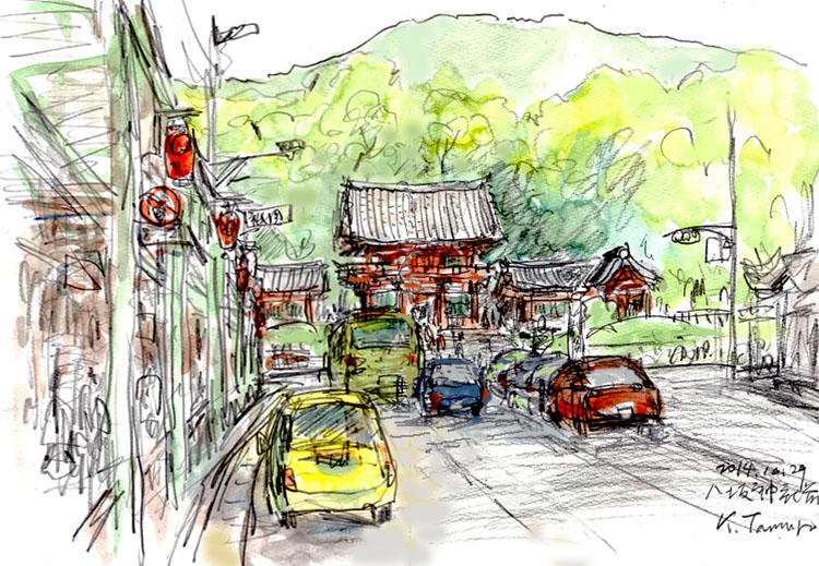 Kさんの素敵なスケッチ作品に誘われて、私もスケッチしたくなり、画廊前の四条通を歩いて八坂神社へ向かう。 ![]() 八坂神社前でのスケッチです。 |