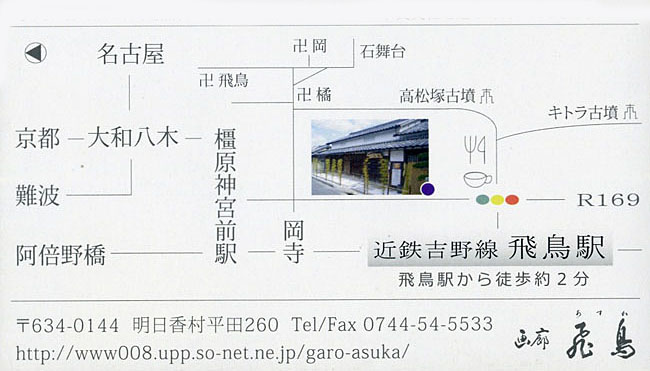 ![]() 画廊飛鳥 携帯付属のカメラなので解像度が低い画像ですみません。 |