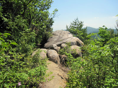 | 大岩は周りを新緑の木々に囲まれている。岩の上は展望があるので、ちょっと早いがここで昼食をとることにしました。 |