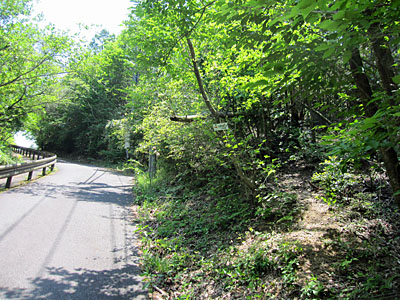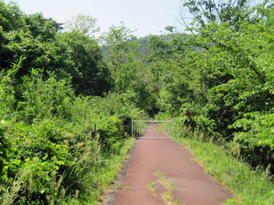 | 福林寺跡はゲート手前を左へ入りますが、旗振り山の登山口はゲートを越えてすぐ左にある広い墓地の片隅にあります。この遊歩道はこの後林道となって希望ヶ丘まで続いています。その峠にあたる所が北縦走路が横断しています。 |