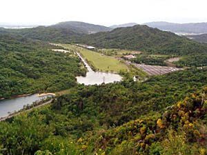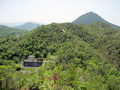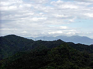 | 眼下の林道の峠にある水施設と北縦走路の先の三上山が見えています。(展望峰の下山路から) |