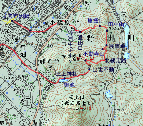 | 今月8日、散歩がてら自宅から歩いて三上山の北縦走路経由で田中山を目指したが、手前のピーク、展望峰でダウン、敗退しました。今回はそのリベンジです。もちろん、ちゃんとした登山装備出かけました。ルートは前回の逆コース、JR野洲駅から北縦走路の終点の山、旗振り山から田中山を目指しました。ストーリーがわかりやすいように、敗退した前回の山行報告 ・三上山中段の道から福林寺跡へ(5月8日) をご覧ください。 |
