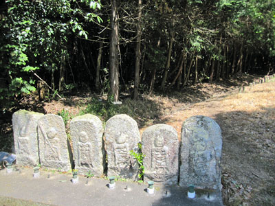 | 墓の左端に六地蔵があり、この後ろに登山道がはじまる。ただし、落ちていた道標には旗振山ではなく、相場振山・かぶと山と書いてありました。相場振山は旗振山の別名です。かぶと山はたしか田中山のことだったと思います。 |