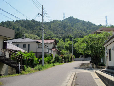 | 旧中山道を歩いて行くと旗振り山、田中山、展望峰(左から)がだんだん近づいてくる。わずか標高300mほどの低山ですがかなり大きく見えてくる。やがて国道8号線の