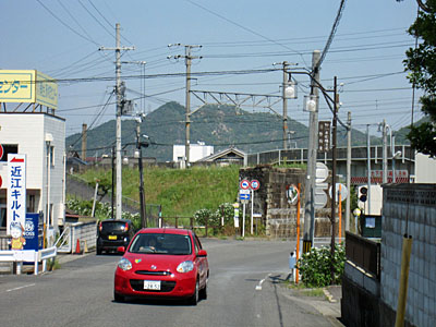 | JR野洲駅前の通りを5分ほど歩くと旧中山道へ入る分岐になる。福林寺跡へはこの道を行く。旗振山の登山口はその福林寺跡(1.7Km)のすぐ後ろにあります。東海道幹線の架橋の後方にこれから登る旗振り山、田中山が見えている。 |