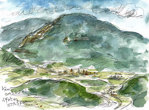 朝刊の滋賀版に醒井水の宿駅(さめがいみずのえき)で比喜多利彌洋画展をやっているという記事を見て急遽醒井(さめがい)へ行くことにしました。あまりによいお天気なので電車に乗ってから醒井周辺の行き先をあれこれ考える。霊仙山も久しぶりだなあ・・・ しかし出かけるのが遅かった上に電車の連絡が悪くて米原で30分も待たされ、醒井駅に着いたら11時20分。登山口の醒井養鰻場行バスが11時45分、これでは霊仙山は時間不足で無理だ。そうだ2年半前に登った松尾寺山へ行こう。洋画展を見てからバスで醒井養鰻場へ。 (今日はデジカメ忘れて携帯電話のカメラなので写真がかなり不鮮明です、ご容赦ください。) ![]() 伊吹山 松尾寺山の登り道からスケッチする。 |