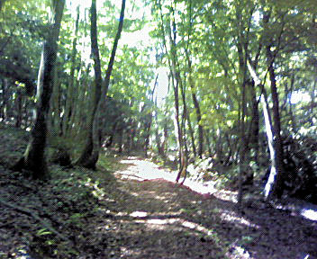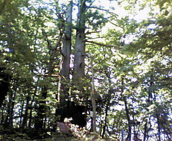 13:30 出発。 頂上へはお寺の右奥から登れば、電線鉄塔を過ぎて、樹林の山頂に着く。 残念ながら三角点は見逃してしまいました。尾根道を歩いて夫婦杉へ向かう。 |