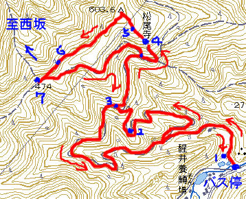 「 ハイキング ルート 」 12:00 バス停出発 1: 霊仙三蔵記念館と醒井楼別館 2: ゲバントハウス(米原工芸研究所) 3: 林道合流 4: 松尾寺跡 5: 影向石(こうようせき) 6: 蔵王権現 7: 夫婦杉 米原地区西坂登山道合流 14:45 バス停帰着 |