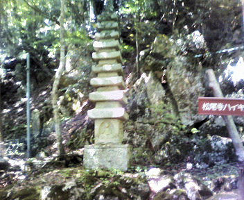 急な石段を登ると松尾寺跡に着く。松尾寺の境内(右の写真) 12:55着 ここで休憩しながら昼食とする。 前回は八葉山で道を間違えて時間をロス、この松尾寺へは立ち寄れなかった。 松尾寺山の歴史 松尾寺山は役の行者が開いたと伝えられ、奈良中期には宣教が創立した霊仙七ヵ寺の一つとして松尾寺が建立されました。平安前期には松尾童子が寺の興隆に力を注ぎ、山岳信仰の霊地として江戸中期まで栄え、坊は50にも達した。松尾寺には、ご本尊飛行観音、影向石、役の行者の斧割水、鐘イリ場、一本橋、ハサミ岩、夫婦杉の七不思議が伝えられている。また、鎌倉中期に建てられた石造九重塔は、国の重要文化財に指定されている。 |