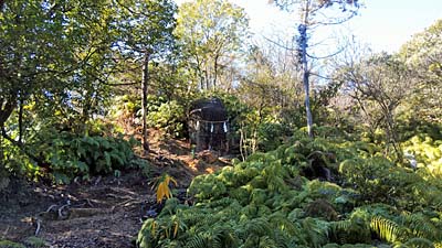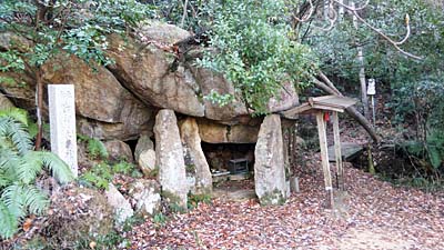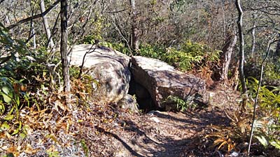 ![]() 古墳?の岩室 このあたりから滑りやすい急な道が稜線までつづく。 |