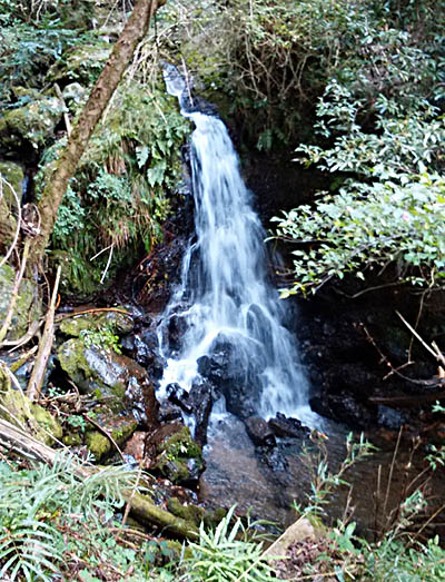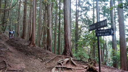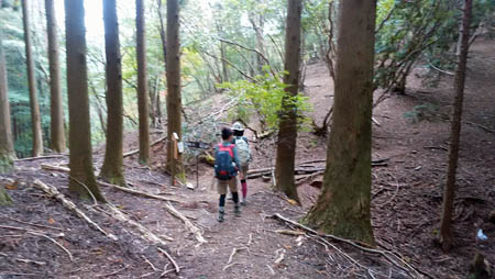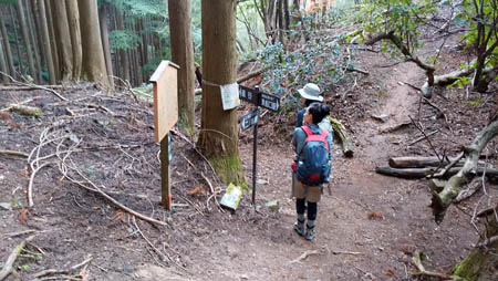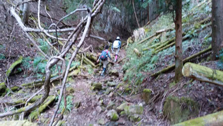 ![]() 滝谷峠分岐からの下り この先、狭くてきつい下りの谷道が続きました。所々ロープが貼ってあり滑らないように注意して下っていく。 |