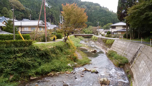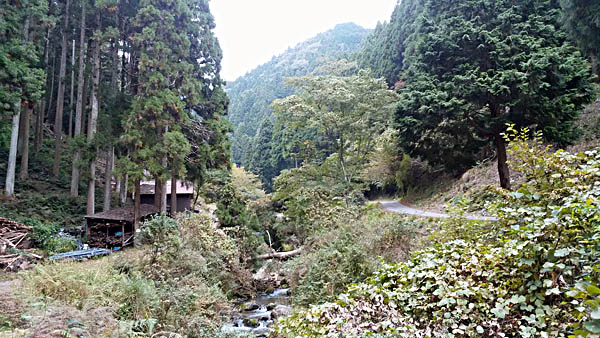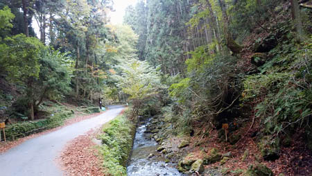 14:18 芹生峠からの舗装路に合流する。この写真は、下ってきた方を振り返って写した風景です。 谷川を挟んで左側がいま滝谷峠から下ってきた道です。右が芹生峠からの舗装路です。 |
