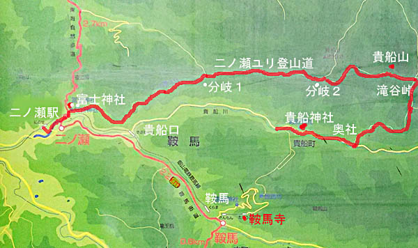![]() 踏切手前にあった案内図 今日歩く貴船神社までのコースを赤ラインで入れました。