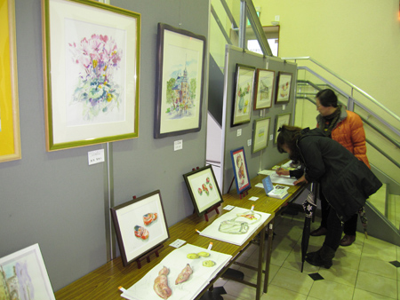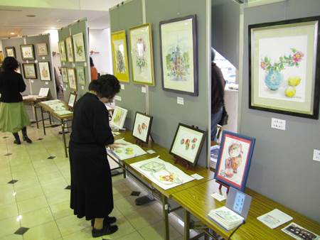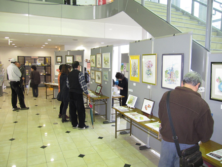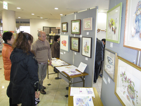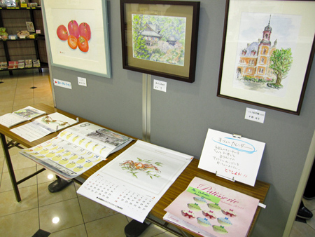 タマちゃん教室のメンバーの自作カレンダーや絵本、作品とバラエティーとんでいる作品展です。