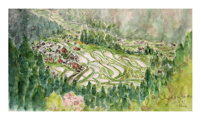 ![]() 滋賀県高島市畑の棚田(水彩スケッチ) F6サイズの用紙2ページを使って時間をかけて棚田の展望を描きました。会場で原画をご覧ください。 これはいつもの早描きスケッチ作品です。スケッチブック2ページに描いているので真中に継ぎ目を隠すスタイルのマットを入れてもらいました。ちょっと写真撮影でぶれてしまいました。すみません。 |