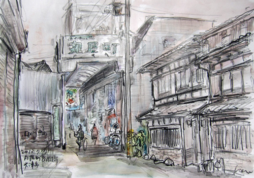 ![]() 町屋を改装したギャラルリーオーの正面 ギャラリーは大津市の丸屋町アーケード街にあります。 ![]() 丸屋町アーケード街の入り口 町屋が残っていてちょっとレトロな感じでしょう この昭和の雰囲気を描きたくて、今年の7月に描いた私(KEN)のスケッチ画です。 |