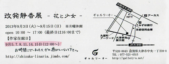 改発静香さんのHP(LINARIA)のURLを記載させていただきました。 自己紹介、作品、お知らせ、活動記録などがご覧いただけます。 http://shizuka-linaria.jimdo.com/ |