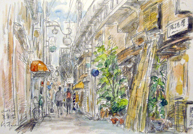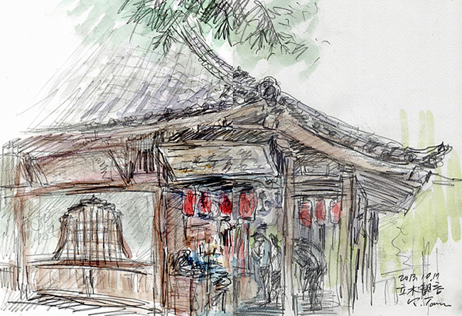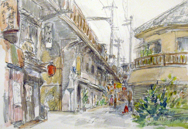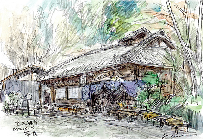 ちょっぴり汗ばんだ体にひんやりとした空気が気持ちよい。この風情のある「御茶所」であったかいレモン茶をいただきながらスケッチしました。 A4×2 水彩 |