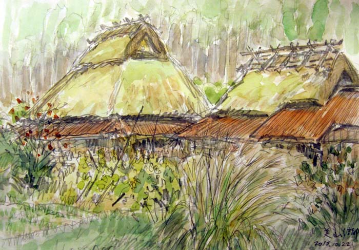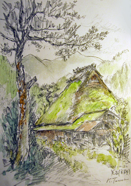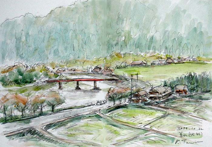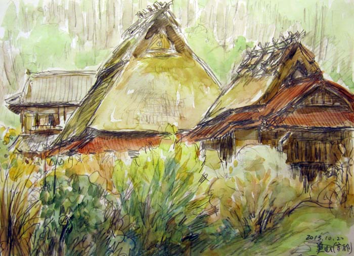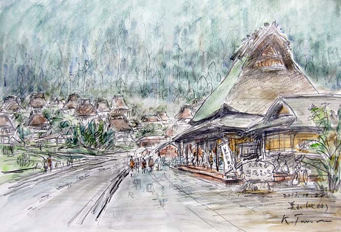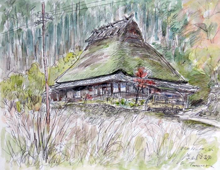 10月23日の浪漫会のスケッチ会は「美山の萱葺」でしたが、天気不良で中止の連絡が入る。是非行ってみたかったので前日の22日に急遽一人で出かけました。降雨率20%を信じて行ったけど、美山の北村地区へ着いたら小雨が降り出してきた。守山からJR山陰線で日吉駅へ、そこから丹南市営バスで北村地区へは二時間半もかかる。そんな事情なので小雨には負けていられない。なんとか頑張ってスケッチ散策してきました。さすが人気観光スポットですね、ウイークデイでも結構観光客が来ていました。