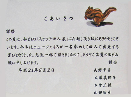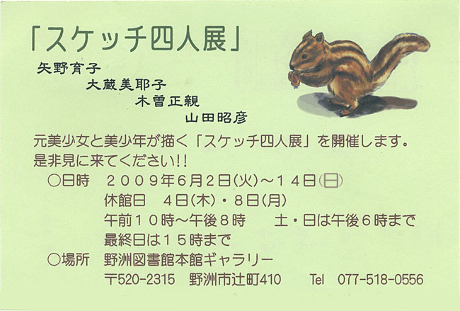 今日、絵仲間の4人展を見に野洲図書館へ行ってきました。この前拝見したと思っていたらもう1年が、早いものですね。6月14日(日)まで開催されていますので、紹介ページを作らせてもらいました。 (2009.6.6) |