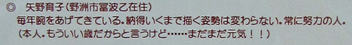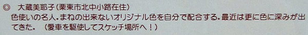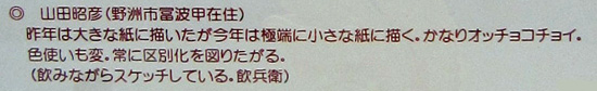 山田さんの作品はよく拝見していて、その力強い鉛筆の線で大きなスケッチブックいっぱいに大胆に描かれているモノクロ画でおなじみでした。それが今回は野洲の建屋風景をミニ作品に、しかも鮮やかな色づかい、少々びっくりしました。いろんなことに挑戦されているのだ。 ![]() |