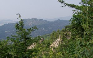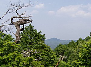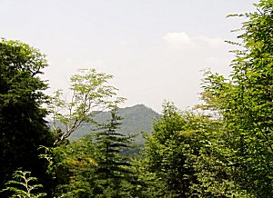 矢筈ガ岳への分岐を右に見て二尊門に向かう途中、右手の林間から矢筈ガ岳が見える。