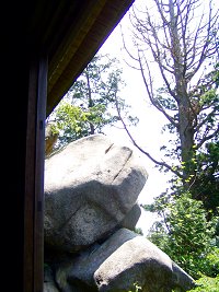 二尊門を入りひと登りすると境内に着く。小さな社と杉の大木の間から本堂への急な階段がある。本堂は巨岩に寄り添うように張り出して建てられているが樹林で見えない。右の写真はその本堂から覗いて巨岩を撮っています。本堂の全体が撮れないのが残念だ!境内で昼食をとり矢筈ガ岳に向かって先ほどの分岐まで引き返す。