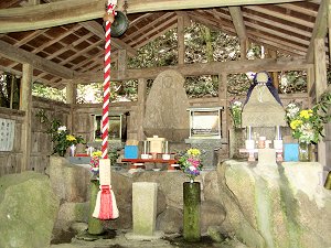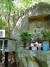 迎え不動を過ぎ、少し行った所で道路は左へカーブする。そこにちょっとした広場があり、お地蔵さん?がある。ここに直進できる道があり、休憩していた中高年のパーティ(同じバスに乗っていた人たち)もここから入るのかと早合点して山道へ。もちろんあるはずの道標もないのに(^_^;)・・