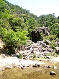 天神川沿いの舗装道路を30分ほど歩くと「迎え不動」につく。その対岸の大きな岩のある谷筋を登って行くと鎧ダムがある。以前、鎧ダム・堂山にここから登りました。ほんとの登山口はこの大岩のある小さな沢の10mほど左にあります。