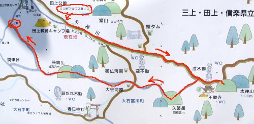 9:50 アルプス登山口に着く。上の看板はバス停にあった案内板です。赤いラインが歩いたコースです。