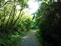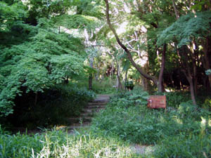 薄暗い樹林帯の中で突然散歩者?に出会い一瞬ドキッとしました。民家が近いことがわかりました。