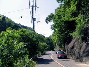 関大明神から細い旧西国街道を西へ、サントリーの山崎蒸留所が正面に見えてくる。 |