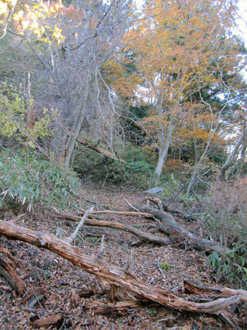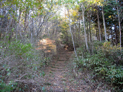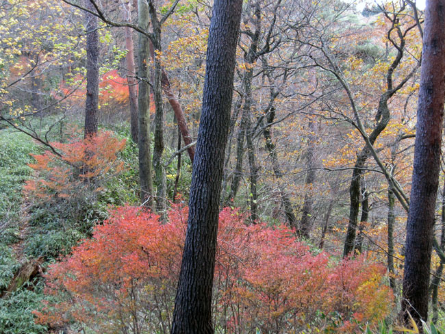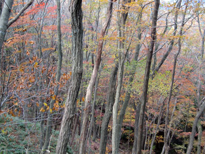![]() 15ほど歩くと植林帯から雑木林の紅葉に・・・ |