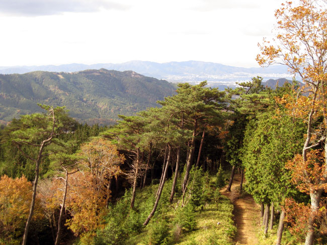 ![]() 阿星山頂上の手前からの展望 見えている道はいま登ってきた登山道です。 すこし向こうに隣の山、竜王山から鶏冠山(右)が望める。 その向こうに京都との県境にある音羽山が見渡せる。その麓は石山から大津の市街が・・・ |