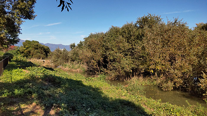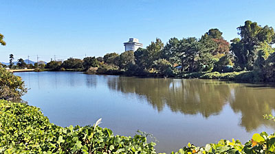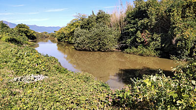 | 南流址は下流になるほど川幅が広くなってくる。だが水の流れはなく滞留しているだけだ。対岸の比良山系の山や湖岸の高層マンションも大きく見えてくる。 |