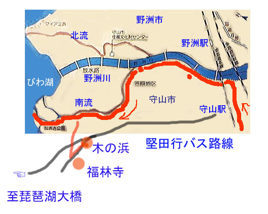 | 拝観護、ウオーキングすることに・・・。 思いついたのは、ここからあまり遠くない旧野洲川の南流址をたどって琵琶湖岸まで歩くというコースです。このコースなら、びわこ大橋傍にある大型ショッピングセンター「ピエリ守山」の無料送迎バスが利用できる。JR堅田駅行きとJR守山駅行きが1時間ごとに一本運行されている。
