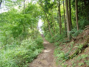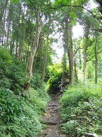 案内板にしたがい旧登山道のコンクリート階段を歩く。やがて写真のような山になる。 |