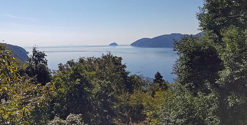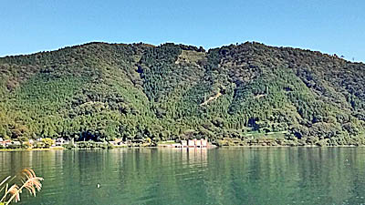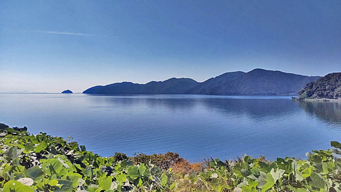 | 竹生島から葛籠尾崎が一望できる。風がないので湖面は鏡のようだ。 |