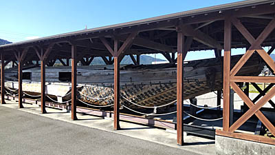 江戸時代には、北国諸藩から京都、大阪に向け年貢米、ニシン、海藻、紅花などが運ばれ、逆に京都、大阪からは陶器や漆器、反物、着物などが琵琶湖を通って運ばれた。この湖上運搬を支えたのが琵琶湖特有の木造船「丸子船」です。江戸時代の享保年間には西浅井地区の三つの港(大浦・菅浦・塩津浜)に、積載量が米俵225表以上の大きな丸子船が89隻あったと説明板に・・・。 |