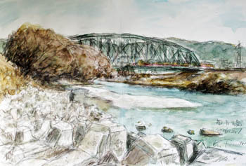 この日は暖かい日に誘われて、京都市北区にある「府立堂本印象美術館」へ”モダンなときめき「智積院襖絵の魅力」展を見に出かけました。鑑賞した後、どこかスケッチしようと、伏見へ移動、久々に「三栖の閘門」を描こうと伏見港公園へ。でも、一枚目に描いたのは、宇治川に架かる近鉄京都線の鉄橋(上左)でした。この鉄橋は”日本最長の無橋脚鉄橋”ということで脳裏にあったからです。