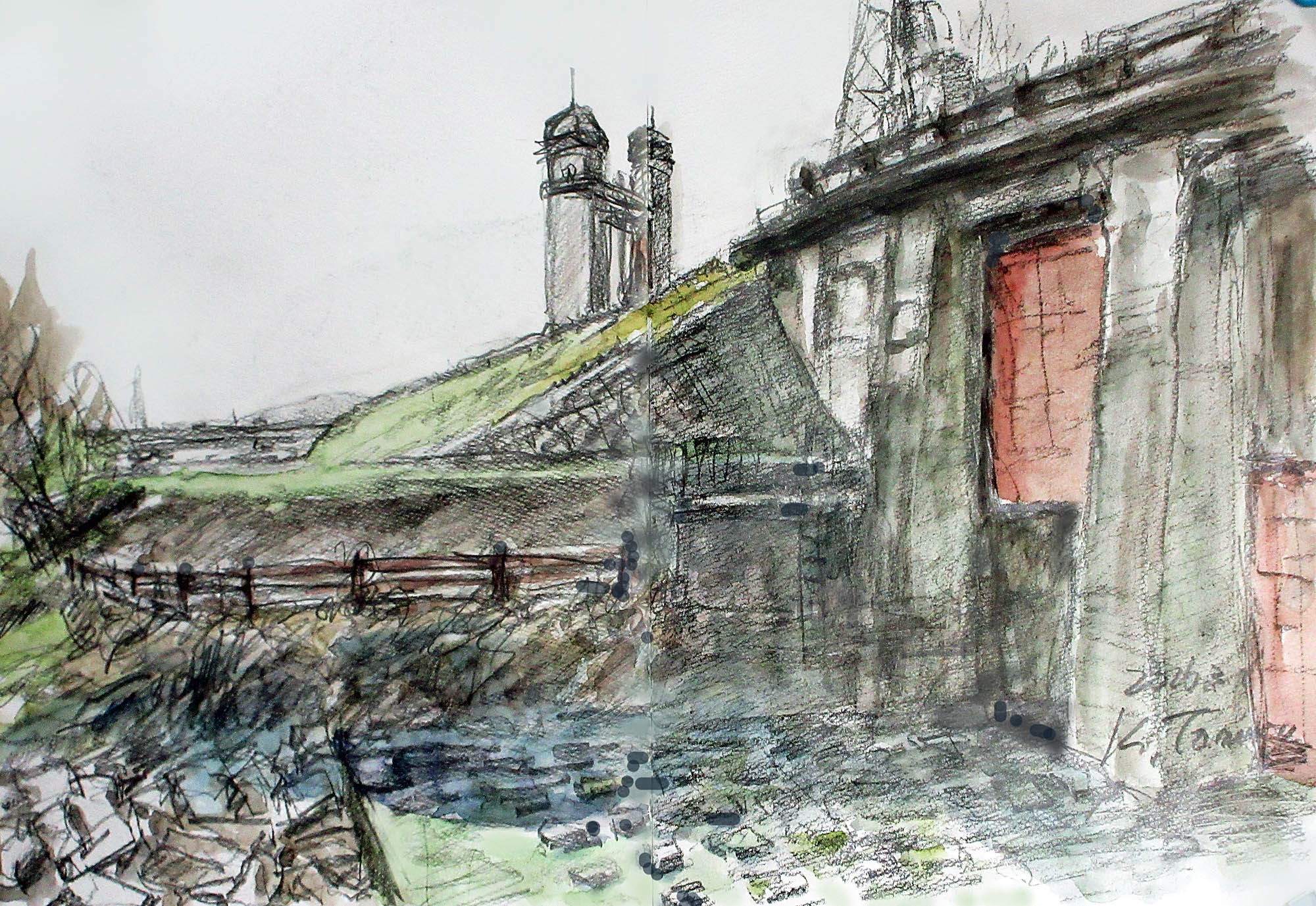 二枚目(上右) スケッチ二枚目は濠川の水門から”三栖の閘門”を遠景に入れてスケッチしました。 三栖閘門は、宇治川と濠川の合流点に位置し、1929年に開業しました。この閘門は、宇治川と濠川の水位差を調整し、船の往来を可能にする施設です。(2026-03-01)