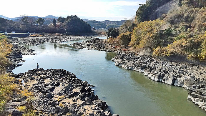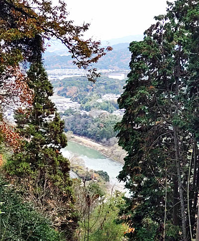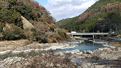 | バス停のある大石小学校前へ向かう。鹿跳(ししとび)橋から瀬田川下流方向を写しています。 |